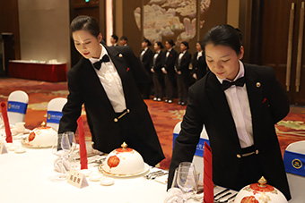 结业之际,一场对标国宴规格的全位上菜式答谢晚宴璀璨启幕,西安酒店行业协会领导应邀出席。晚宴现场严格遵循国宴标准精心布置:餐台布局融入对称美学巧思,餐具陈列彰显层级分明的礼仪规范,花艺装饰以雅致配色勾勒典雅意境,灯光氛围经精准调控烘托尊贵质感,豪华气派与精致典雅在此完美交融。值得一提的是,学员们将课堂所学的摆台技艺与服务设计理念,悉数融入晚宴布场的细节之中,让每一处陈设都成为高端服务标准的生动范本,更化作见证学员专业成长的鲜活印记。